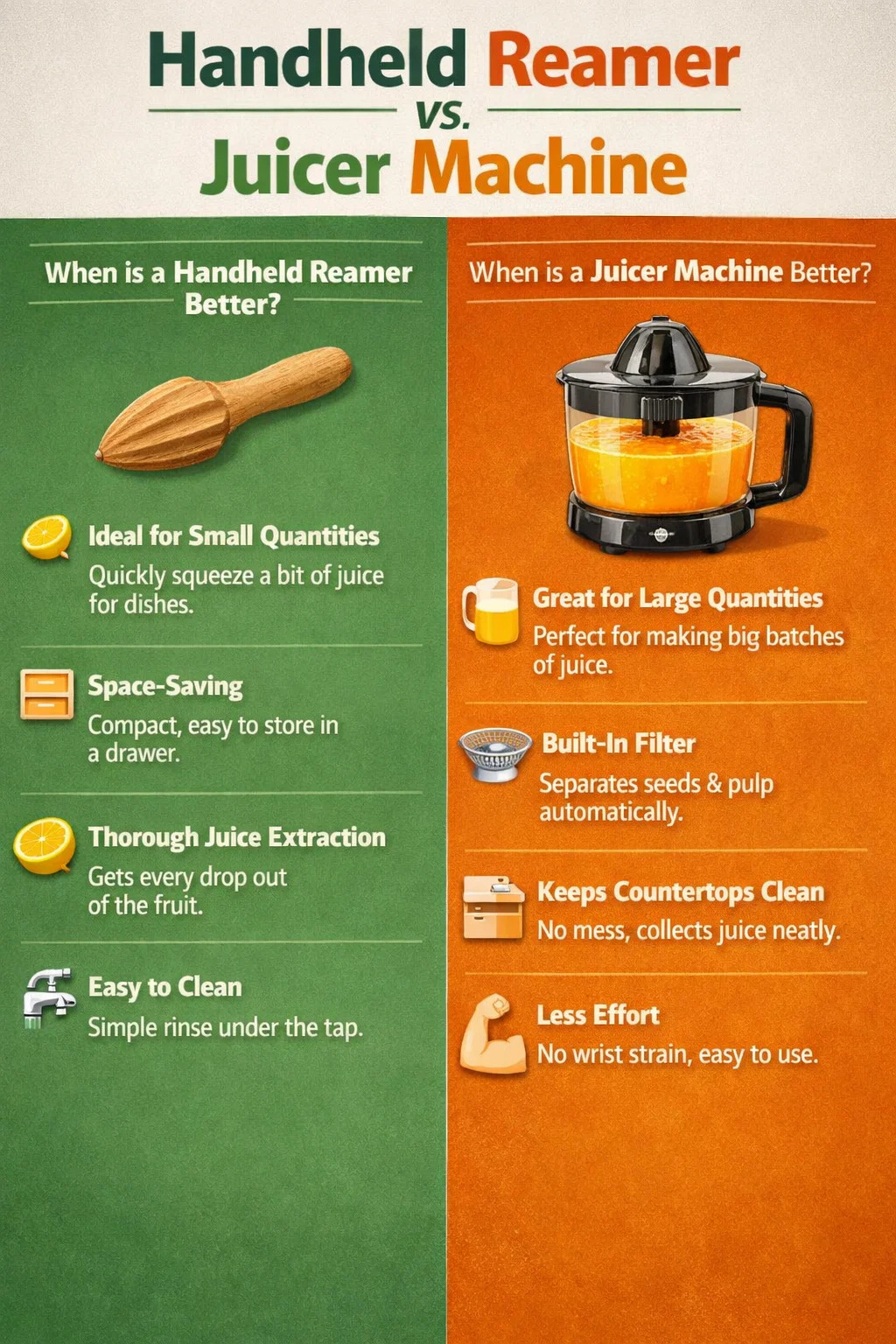 V kuchyni je cenovo výhodnejšie použiť ručný výstružník alebo a odšťavovač s miskou alebo motorom? Ide v podstate o kompromis medzi „úsilím“ a „účinnosťou“.