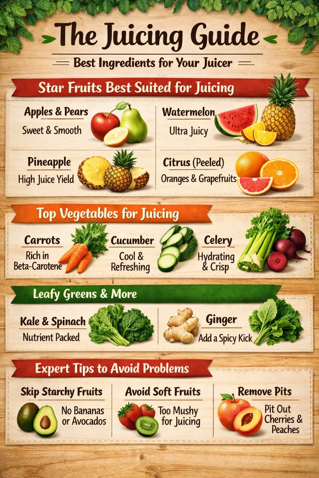Jablká a hrušky: Títo dvaja sú starí priatelia všetkých odšťavovačov. Sú šťavnaté a šťava, ktorú produkujú, je sladká a hladká. Jablkový džús je tiež základom mnohých miešaných štiav, pretože sa hodí takmer ku všetkému.