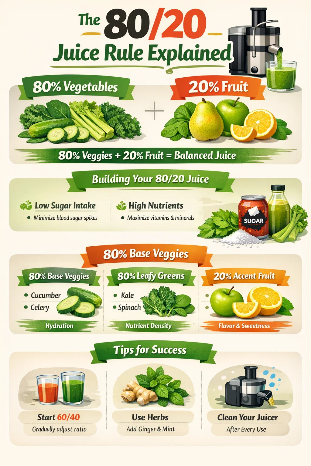 The Pravidlo 80/20 pre odšťavovanie je výživová smernica, ktorá uvádza, že na každý pohár šťavy, ktorý vyrobíte, 80 % ingrediencií by mala byť zelenina a len 20 % by malo byť ovocie . Tento pomer je navrhnutý tak, aby maximalizoval príjem fytonutrientov a minerálov a zároveň prísne obmedzoval spotrebu fruktózy. Pri použití vysokej kvality odšťavovač uľahčuje prípravu lahodných zákuskov, prílišné spoliehanie sa na sladké ovocie môže viesť k nežiaducim výkyvom hladiny cukru v krvi, čo porušuje mnohé zdravotné účely čerstvej extrakcie.