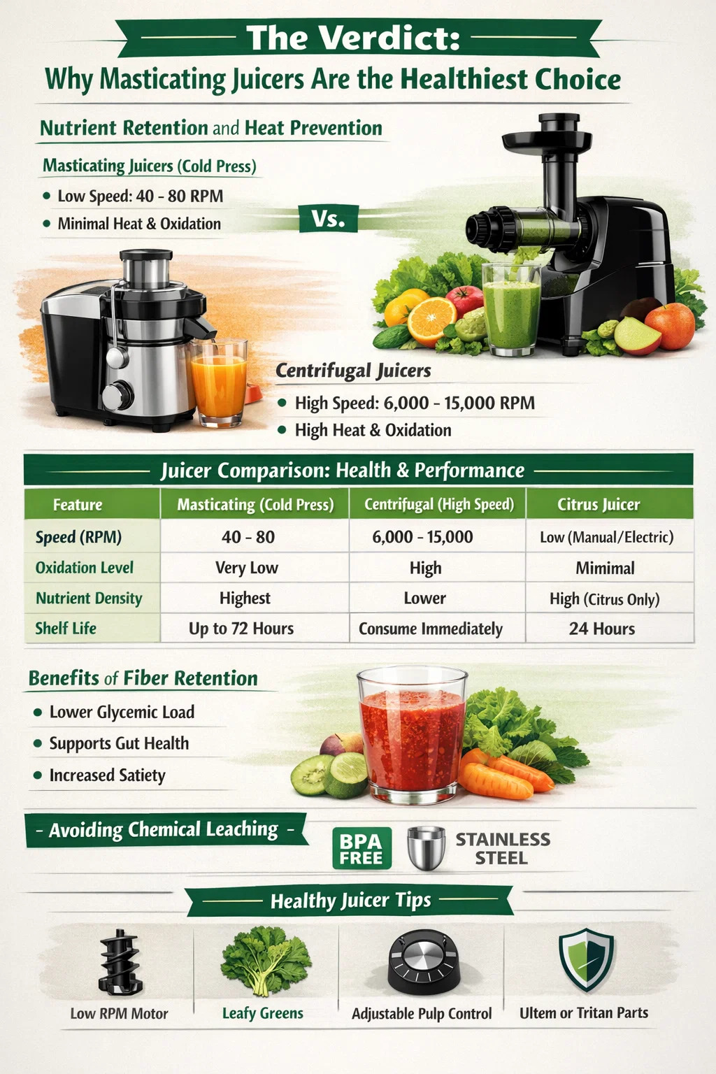 Pri uprednostňovaní zdravia a hustoty živín, žuvací odšťavovač (známy aj ako odšťavovač lisovaný za studena) je najzdravší typ odšťavovača k dispozícii. Na rozdiel od vysokorýchlostných modelov používajú žuvacie odšťavovače na drvenie ovocia a zeleniny pomaly sa otáčajúcu skrutku alebo závitovku, ktorá minimalizuje tepelné trenie a oxidáciu . Tento jemný proces zaisťuje, že jemné vitamíny, minerály a živé enzýmy zostanú nedotknuté, čím sa získa výživnejší nápoj, ktorý môže zostať čerstvý až 72 hodín.